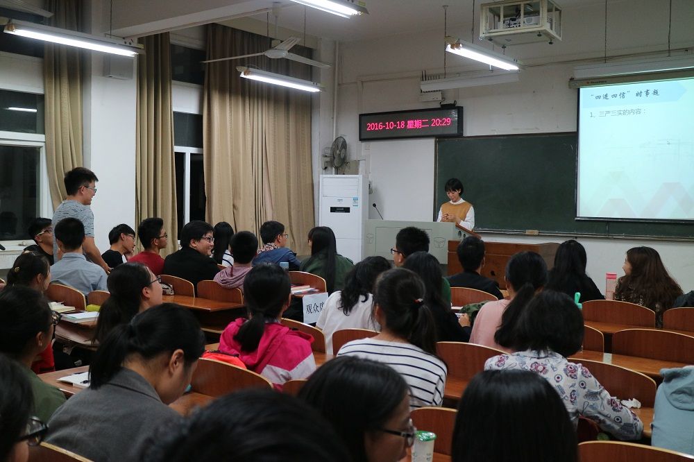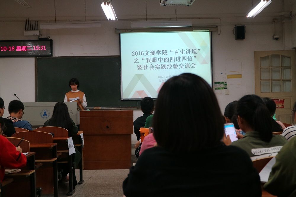 (37000cm威尼斯团委记者 贾璐菲)为弘扬党的精神,加深2016级新生对党的理解,37000cm威尼斯团委于10月18日晚在文澜楼305教室举办了201637000cm威尼斯“百生讲坛”之“我眼中的四进四信”暨社会实践经验交流会,37000cm威尼斯团总支书记余利、院团委负责人及2016级全体新生参加了活动。