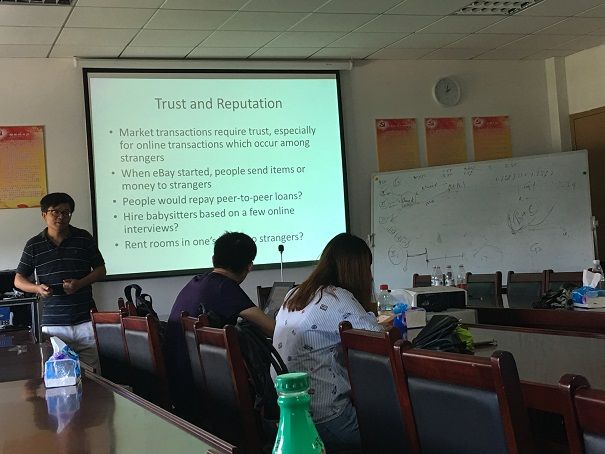 最后,杨教授谈到了网络反馈系统,因为网上交易存在极大的不确定性,所以信任对交易双方来讲是十分重要的。网络反馈系统的存在极大减少了道德风险的发生。杨教授还介绍了一个不完全信息的动态博弈,买家只知道卖家类型的概率分布,基于逆序归纳法,计算出了当只进行一次博弈时,买家进行交易的条件,和进行两次及两次以上存在折现因子的情况下的交易条件。并就现实案例如eBay,淘宝,Airbnb进行分析,与同学们互动。